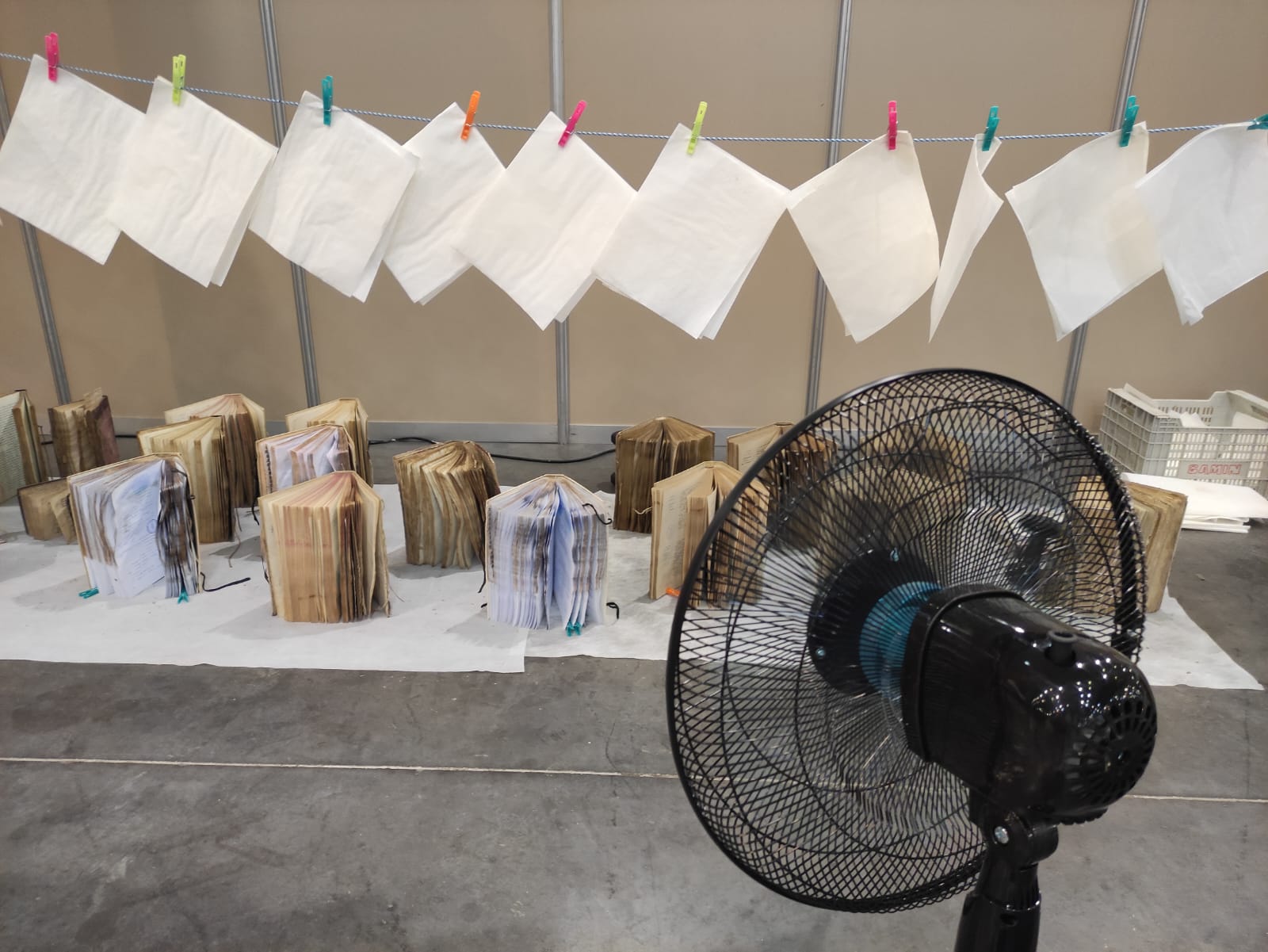 Los trabajos que se están realitzando consisten: Eliminación de fango, secado de documentos y estabilización de las obras. La finalidad, evitar la proliferación de hongos y otros daños del papel.