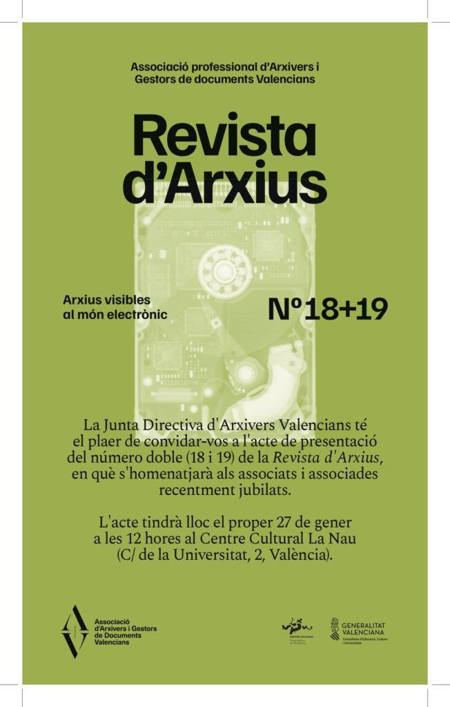 L’Associació Professional d’Arxivers i Gestors de Documents Valencians presenta el número doble 18+19 de la Revista d’Arxius, baix el títol “Arxius visibles al món electrònic”.
